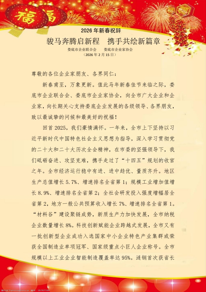 婁底市企業(yè)聯(lián)合會、婁底市企業(yè)家協(xié)會2026年新春祝辭