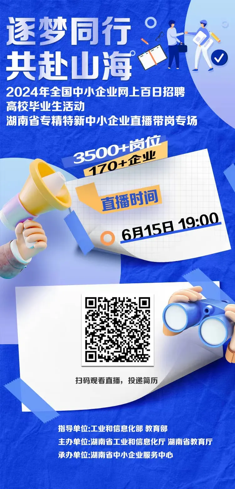 為貫徹落實黨中央、國務(wù)院關(guān)于穩(wěn)就業(yè)的決策部署和省委、省政府工作要求,進一步推進高校畢業(yè)生充分就業(yè)和專精特新中小企業(yè)人才供給工作,根據(jù)工信部辦公廳、教育部辦公廳《關(guān)于開展2024年全國中小企業(yè)網(wǎng)上百日招聘高校畢業(yè)生活動的通知》要求,由省工信廳、省教育廳聯(lián)合主辦,省中小企業(yè)服務(wù)中心承辦的2024年湖南省專精特新中小企業(yè)直播帶崗活動將在6月15日舉行。本場直播活動將邀請5家省內(nèi)優(yōu)秀企業(yè)進行崗位推薦,還有產(chǎn)業(yè)、人才、服務(wù)政策介紹。