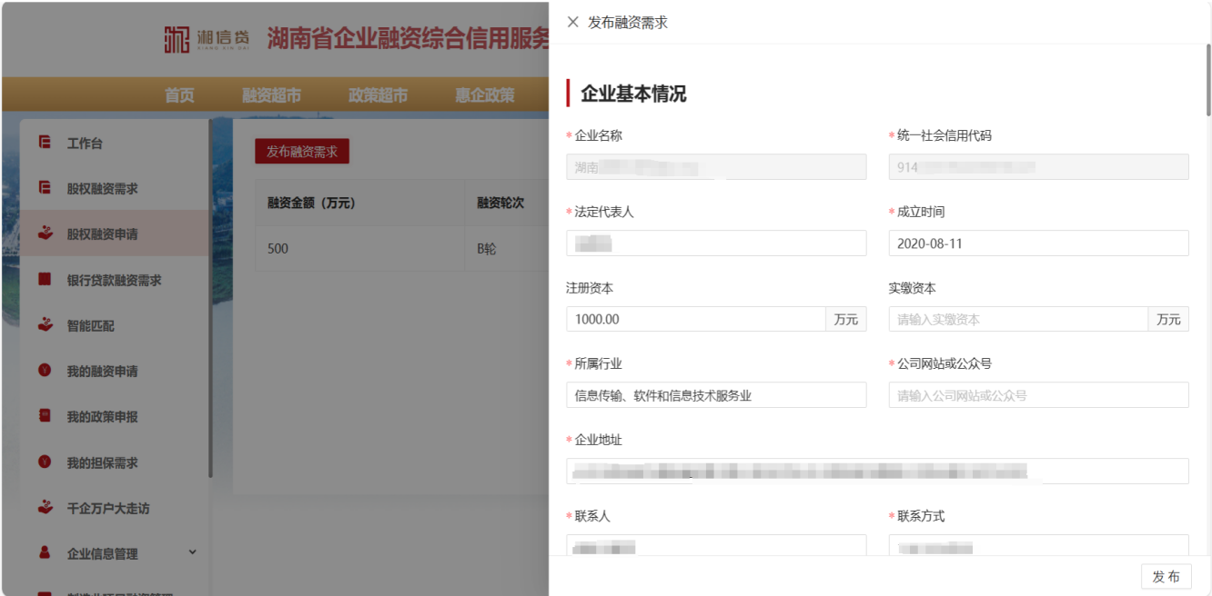 4、登錄成功后,在股權融資需求提交頁面補充融資信息后,點擊提交,完成股權融資需求發(fā)布。