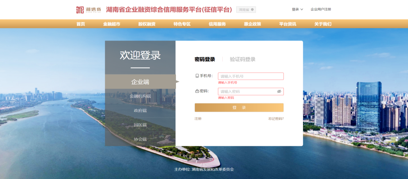 1、“登錄頁面”左下角點擊“注冊”按鈕或在“湘信貸”平臺網(wǎng)站右上角,點擊“企業(yè)用戶注冊”按鈕,進入注冊頁面。