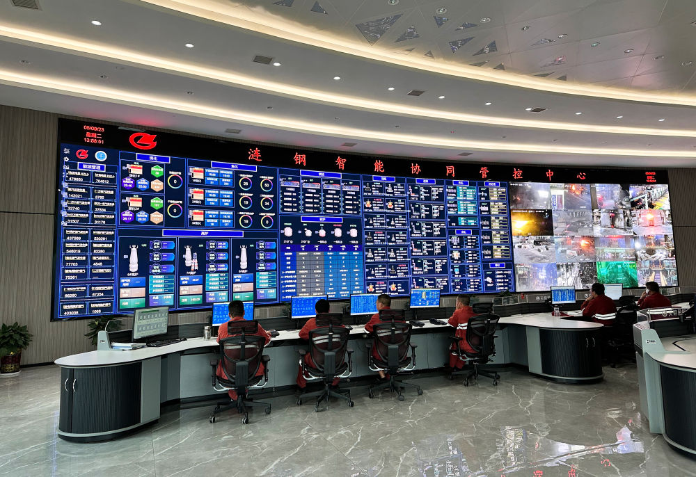 在漣鋼智能協(xié)同管控中心,LED屏幕上躍動著煉鋼環(huán)節(jié)的各項數(shù)據(jù)參數(shù)和生產(chǎn)一線的實(shí)時畫面,技術(shù)工人正在監(jiān)測分析生產(chǎn)動態(tài)信息。